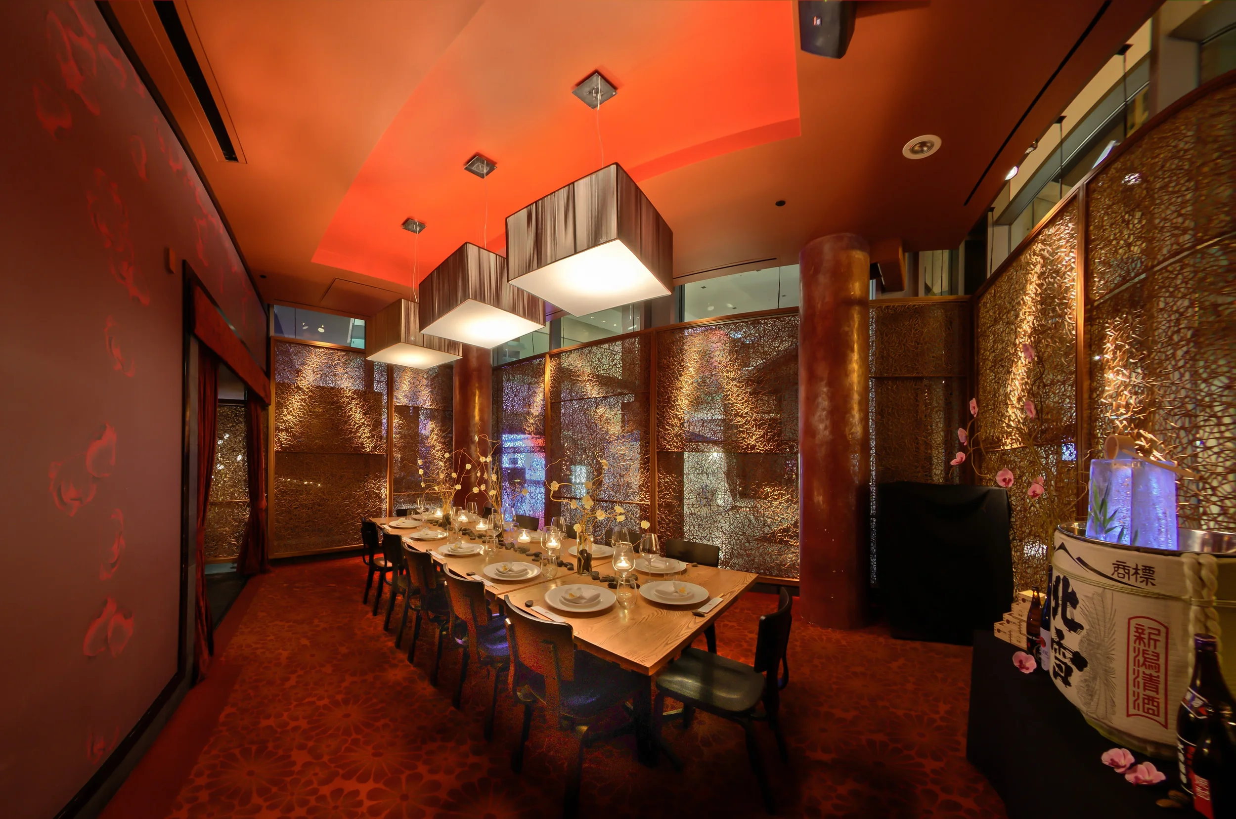 Featuring deep red wallpaper and sheer, square light fixtures, the 300-sqft Private Dining Room is an intimate yet an airy event space ideal for a seated dinner or a small cocktail reception. Guests will enter through dramatic curtains into the room which is surrounded by three decorative vine covered glass walls.